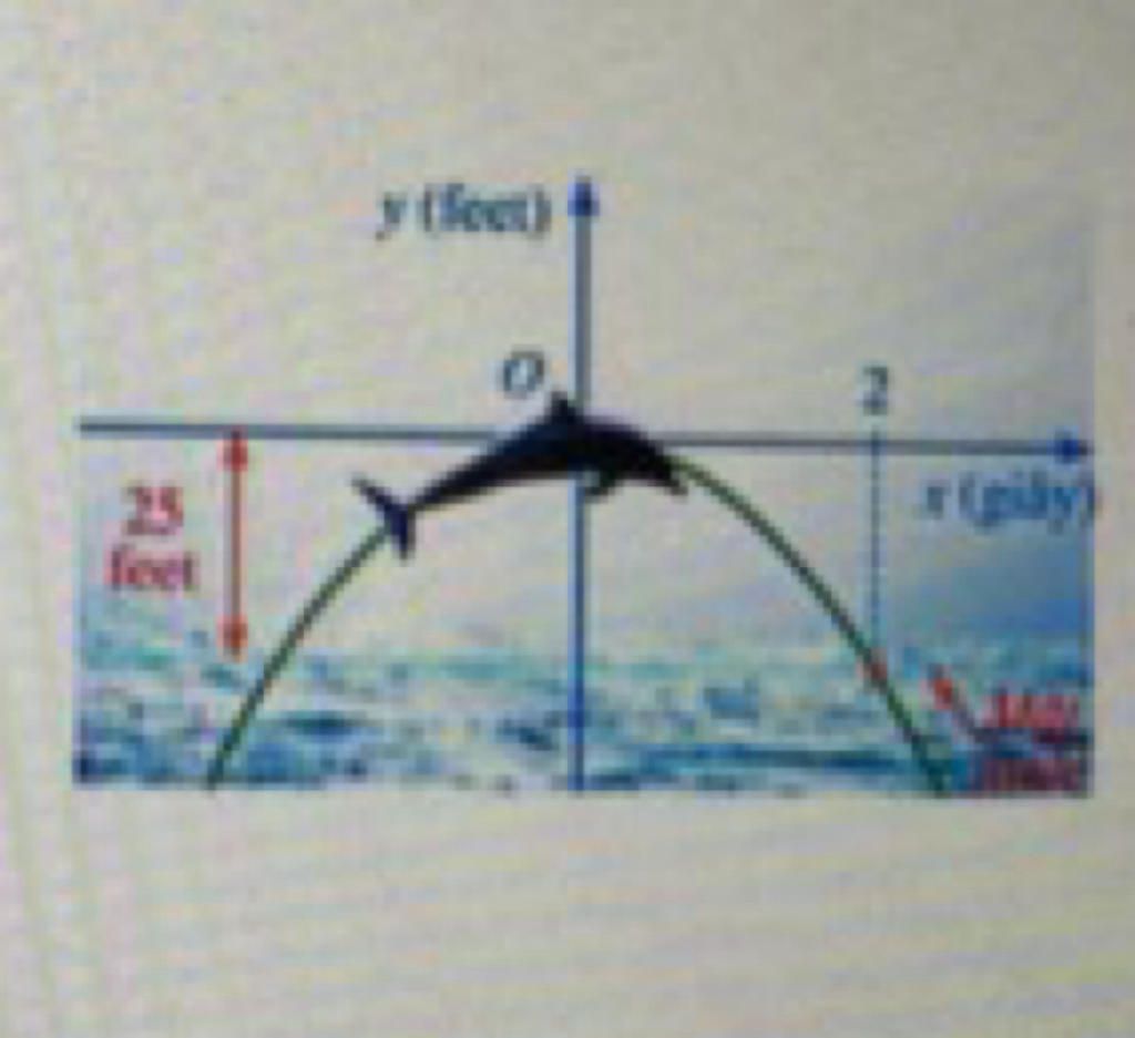 Cá heo có thể nhảy cao tối 25 feet và thực hiện các thủ thuật như nhãy qua vòng, lộn nhào trong không trung. Giữ sử quý đạo nhảy của cá heo là parabol y = ax^2, với gốc toạ độ là vị trí cao nhất mà cá heo đạt được, cách mặt nước 25 feet, trong đó y được tính theo đơu vi feet và x được tính theo đơn vị giây (Hình bên). Biết rằng sau 2 giây kể từ vị trí cao nhất đó, cá heo rơi chạm mặt nước. Tìm hàm số biểu thị quý đạo nhảy của cá heo.