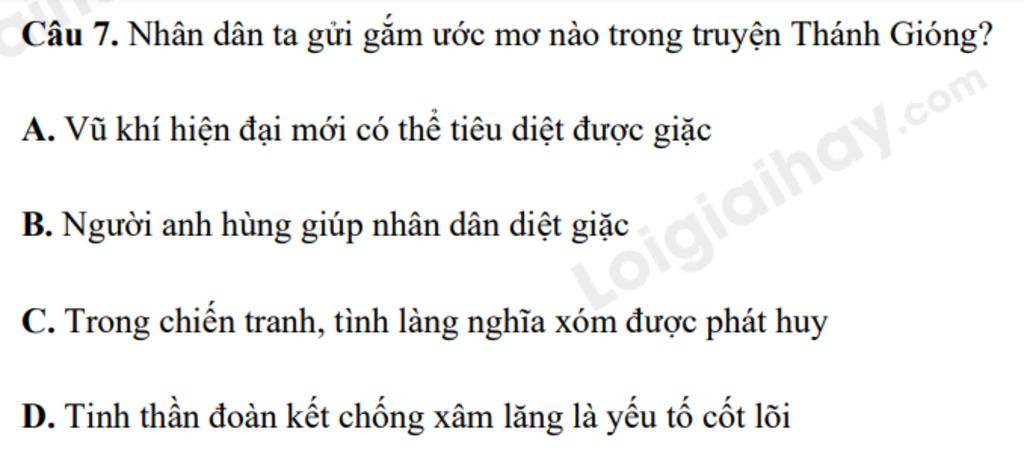 Câu `7:` Nhân dân gửi gắm ước mơ nào trong truyện Thánh Gióng>