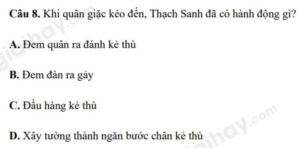 Câu 8. Khi quân giặc kéo đến, Thạch Sanh đã có hành động gì?
