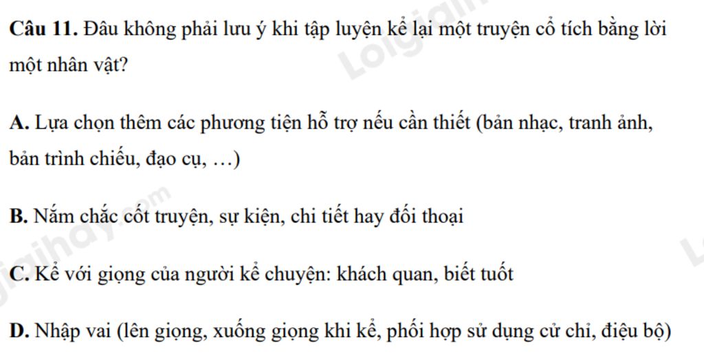 ⇒ Kể với giọng của người kể chuyện: khách quan, biết tuốt không phải lưu ý khi tập luyện kể lại một truyện cổ tích bằng lời một nhân vật.