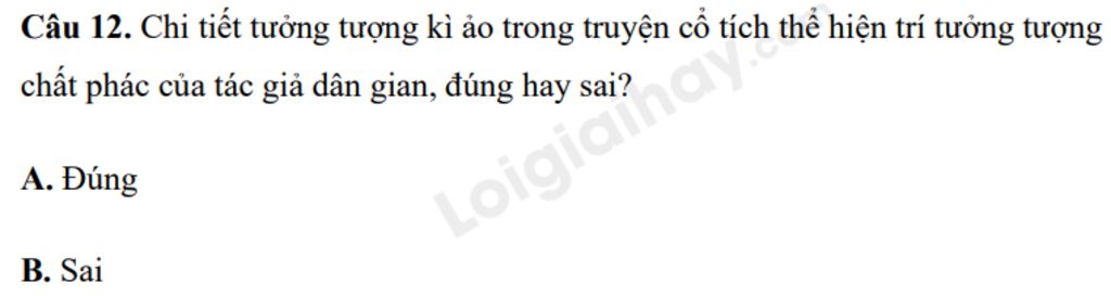 ⇒Chi tiết tưởng tượng kì ảo trong truyện cổ tích thể hiện trí tưởng tượng chất phác của tác giả dân gian đúng.
