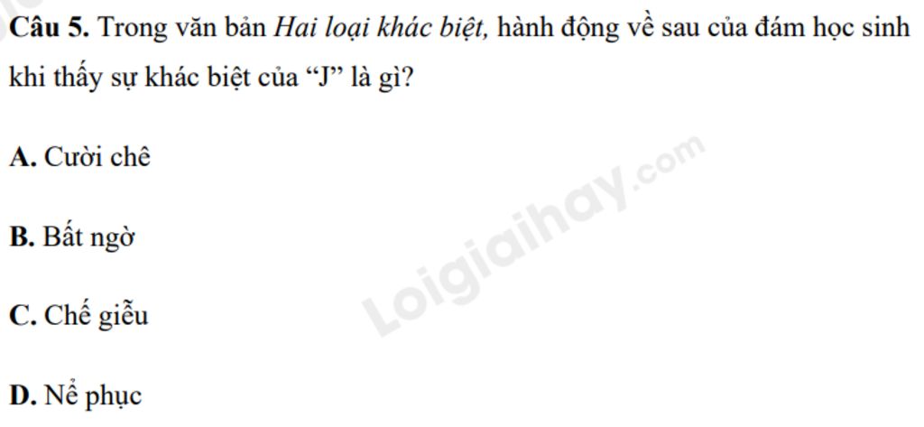 Câu `5` : Trong văn bản "Hai loại khác biệt", hành động về sau của đám học sinh khi thấy sự khác biệt của “J” là gì?