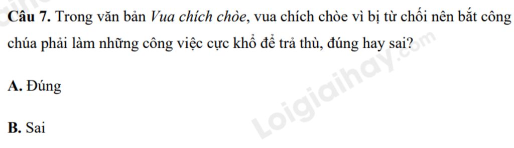 `=>` câu "vua chích chòe vì bị từ chối nên bắt công chúa phải làm những công việc cực khổ để trả thù" trong văn bản Vua chích chòe là sai.