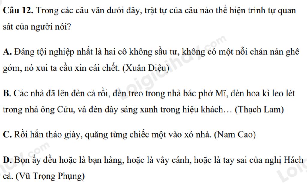 Câu 12. Trong các câu văn dưới đây, trật tự của câu nào thể hiện trình tự quan sát của người nói?