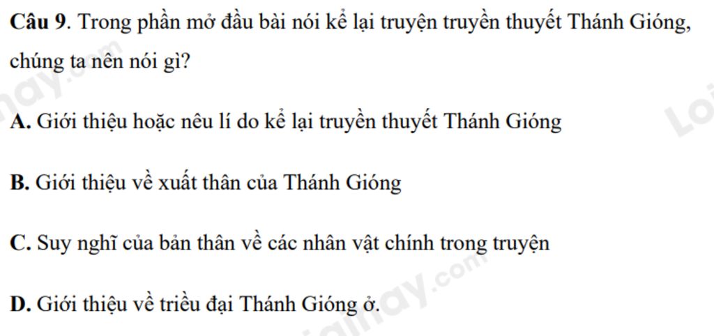 Câu `9.` Trong phần mở đầu bài nói kể lại truyện truyền thuyết Thánh Gióng, chúng ta nên nói gì?