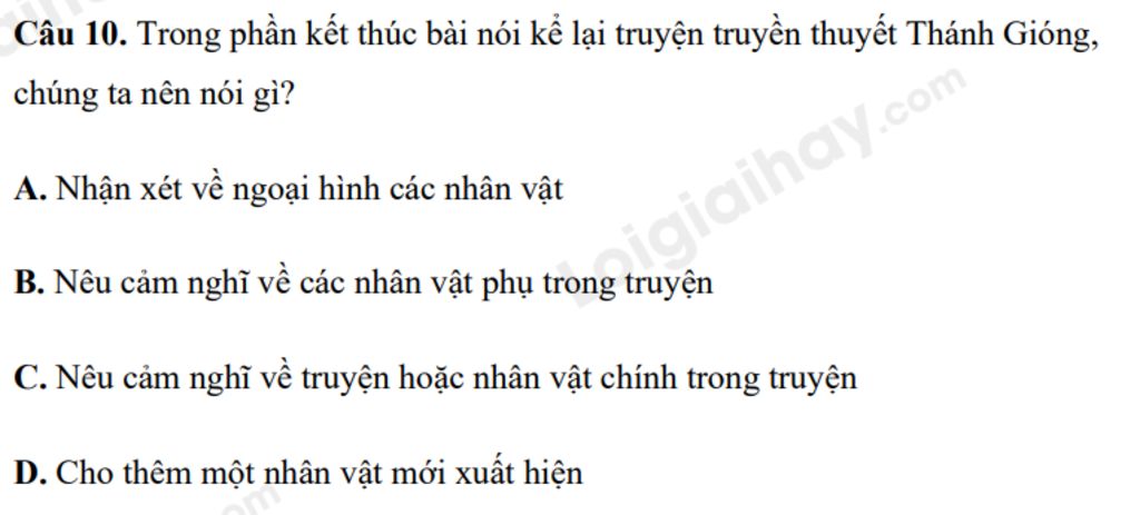 Câu `10`. Trong phần kết thúc bài nói kể lại truyện truyền thuyết Thánh Gióng, chúng ta nên nói gì?