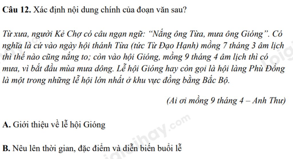 `->` Chọn đáp án `A.` Giới thiệu về lễ hội Gióng