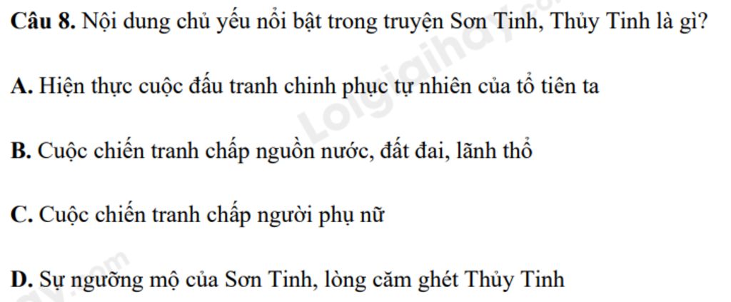 ⇒ Nội dung chủ yếu nổi bật trong truyện Sơn Tinh, Thủy Tinh là hiện thực cuộc đấu tranh chinh phục tự nhiên của tổ tiên ta.