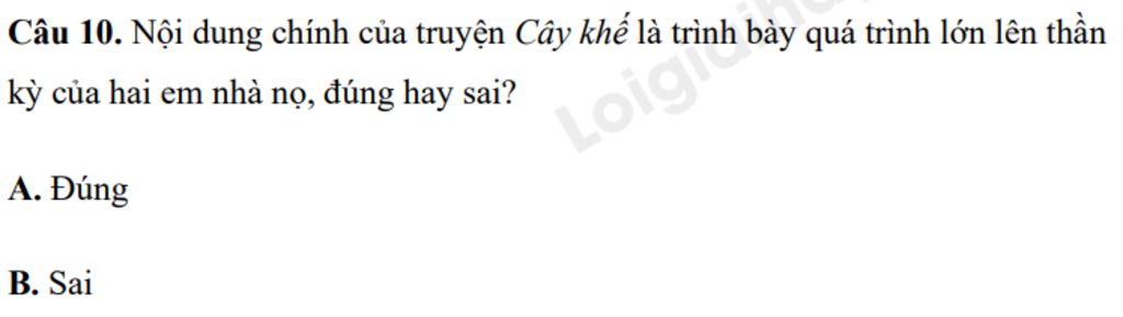 Câu 10. Nội dung chính của truyện Cây khế là trình bày quá trình lớn lên thần kỳ của hai em nhà nọ, đúng hay sai?