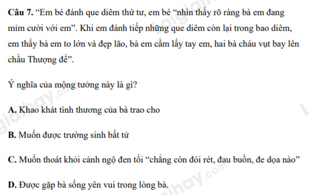Câu `7.` “Em bé đánh que diêm thứ tư, em bé “nhìn thấy rõ ràng bà em đang mỉm cười với em”. Khi em đánh tiếp những que diêm còn lại trong bao diêm, em thấy bà em to lớn và đẹp lão, bà em cầm lấy tay em, hai bà cháu vụt bay lên chầu Thượng đế”. Ý nghĩa của mộng tưởng này là gì?