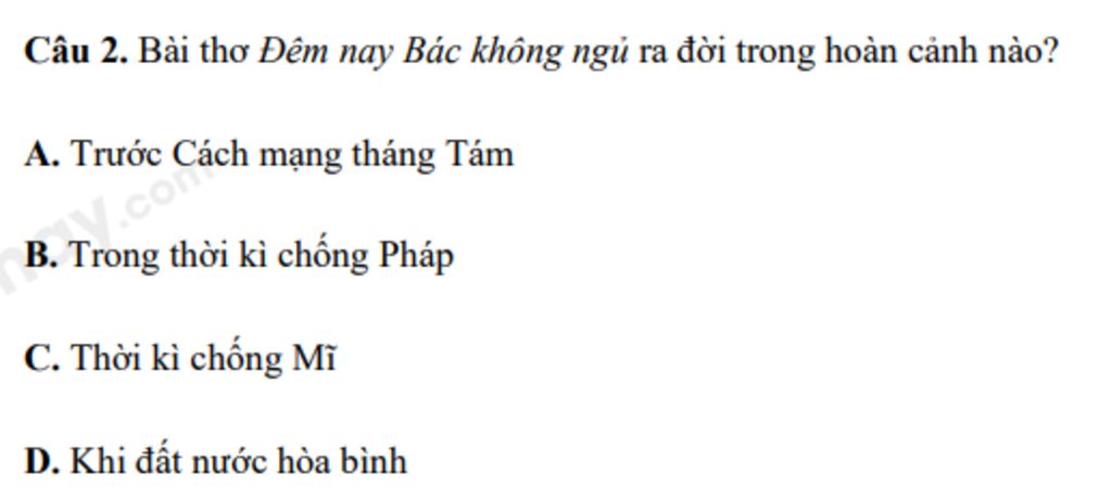 Câu `2` : Bài thơ "Đêm nay Bác không ngủ" ra đời trong hoàn cảnh nào?