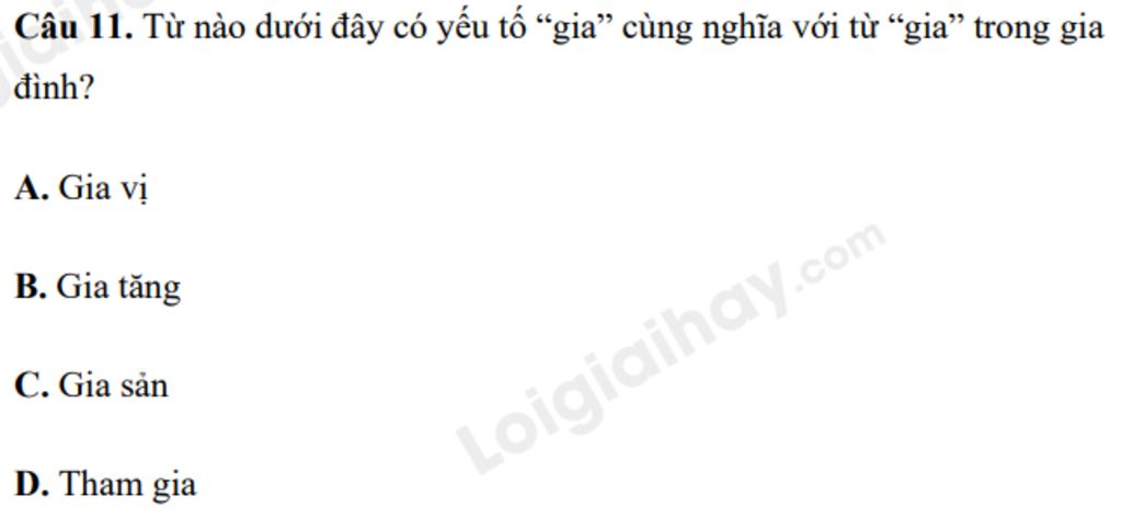 Từ có yếu tố “gia” cùng nghĩa với từ “gia” trong "gia đình" là : gia sản