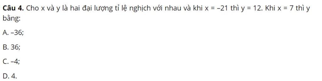 Vì `y `và `x` là hai đại lượng tỉ lệ nghịch và `x = -21` khi `y = 12` nên ta có hệ số tỉ lệ là