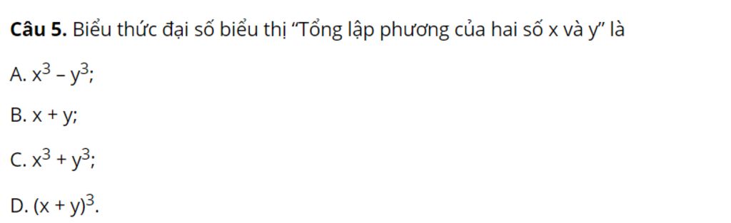 `-` Biểu thức đại số biểu thị “Tổng lập phương của hai số x và y” là `x^3+y^3`