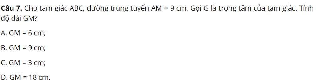 $\Rightarrow \text{GM} = \dfrac{2}{3} \text{AM}= \dfrac{2}{3} \cdot 9 = 6 (cm)$ (t/c đường trung tuyến)