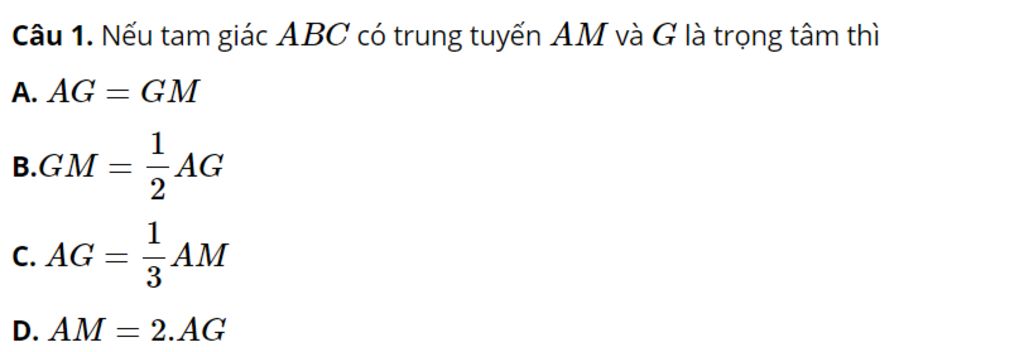 `->``bbB`$\\$Nếu `ΔABC` có trung tuyến `AM` và `G` trong tâm thì `G M = 1/ 2 A G`