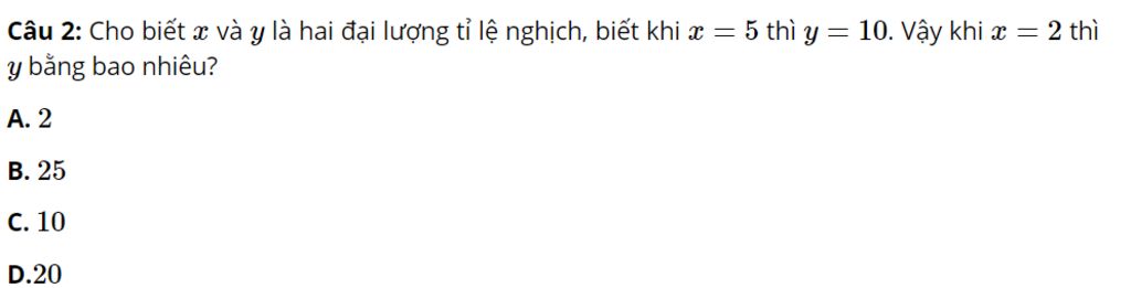 Vì y và x là hai đại lượng tỉ lệ nghịch và `x = 5` khi `y = 10` nên ta có hệ số tỉ lệ là