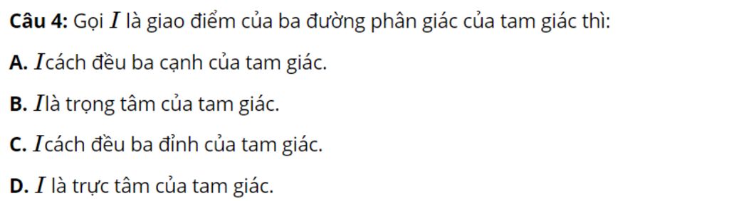 Câu 4: Gọi I là giao điểm của ba đường phân giác của tam giác thì: