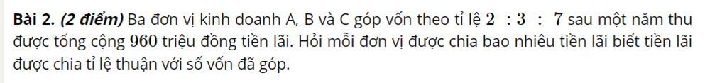Vậy ba đơn vị kinh doanh `A,B,C` được chia số tiền lãi lần lượt là `160;``240``;``560` triệu đồng.