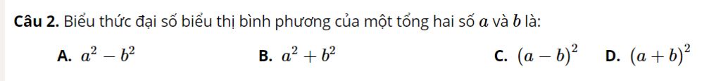 Biểu thức đại số biểu thị bình phương của một tổng hai số a và b là:`(a+b)^2`