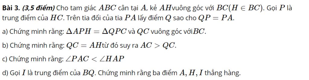 Bài 3. (3,5 điểm) Cho tam giác ABC cân tại A, kẻ AHvuông góc với BC(H < BC). Gọi P là trung điểm của HC. Trên tia đối của tia PA lấy điểm Q sao cho QP = PA.