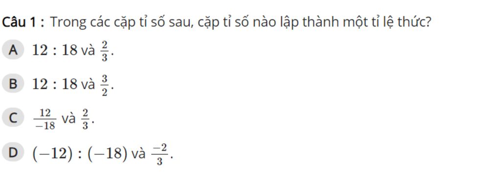 Vậy `12 : 18` và `2/3` có thể lập thành một tỉ lệ thức .