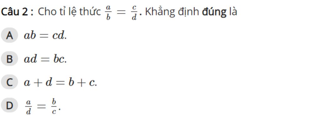 Áp dụng:Cho tỉ lệ thức `a/b=c/d` khẳng định đúng là `a.d=b.c`