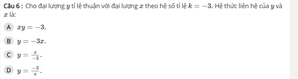 Đại lượng `y` tỉ lệ thuận với đại lượng `x` theo hệ số tỉ lề `k=-3`.Hệt thức liên hệ cuaer `y` và `x` là `:y=-3x`