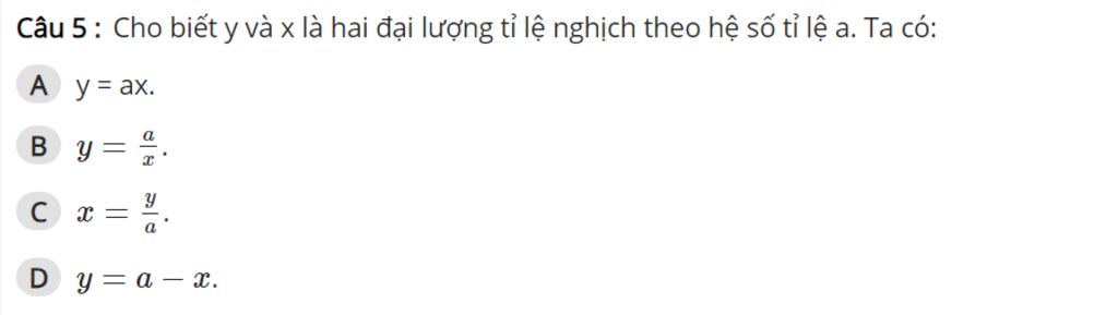 Vì x, y tỉ lệ nghịch với nhau theo hệ số tỉ lệ `a`