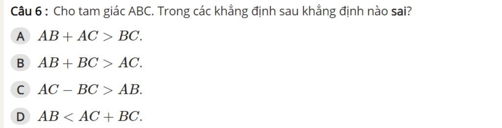 `@` Bất đẳng thức tam giác: trong `\triangleABC` có: