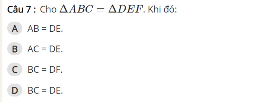 `\triangleABC=\triangleDEF`.Khi đó `:`