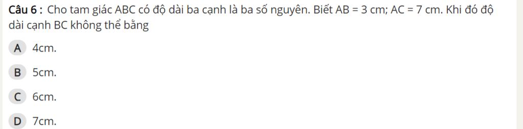 Câu 6 : Cho tam giác ABC có độ dài ba cạnh là ba số nguyên. Biết AB = 3 cm; AC = 7 cm. Khi đó độ dài cạnh BC không thể bằng