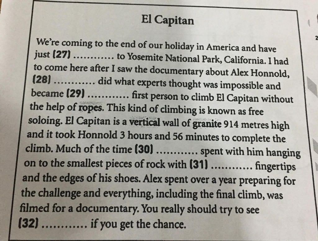 We're coming to the end of our holiday in America and have just (27) been to Yosemite National Park, California. I had to come here after I saw the documentary about Alex Honnold, (28) who did what experts thought was impossible and became (29) the first person to climb El Capitan without the help of ropes. This kind of climbing is known as free soloing. El Capitan is a vertical wall of granite 914 metres high and it took Honnold 3 hours and 56 minutes to complete the climb. Much of the time (30) was spent with him hanging on to the smallest pieces of rock with (31) his fingertips and the edges of his shoes. Alex spent over a year preparing for the challenge and everything, including the final climb, was filmed for a documentary. You really should try to see (32) it if you get the chance.