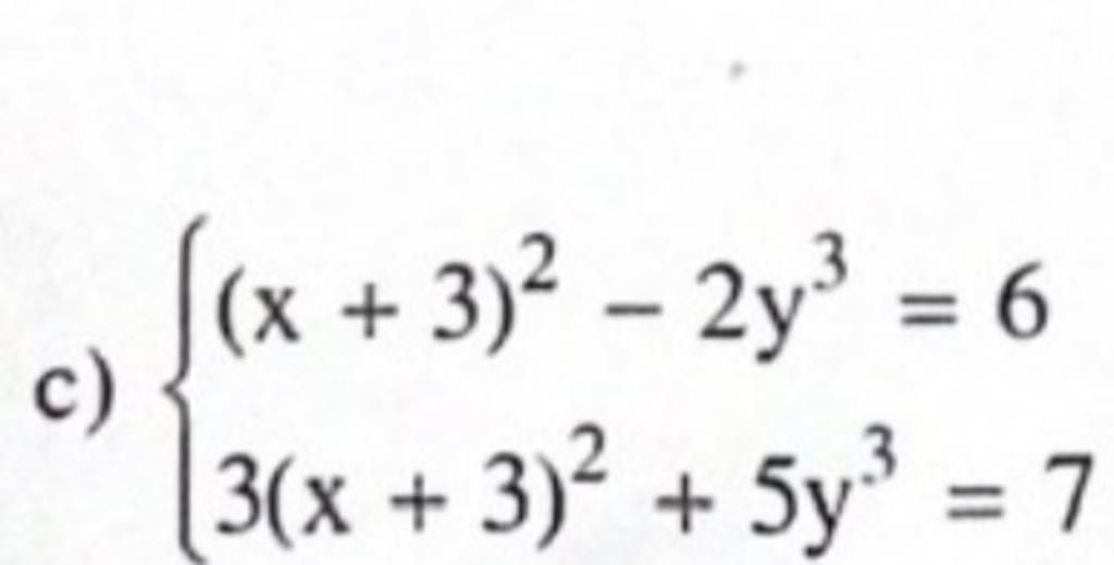 `c){((x+3)^2-2y^3=6),(3(x+3)^2+5y^3=7):}`