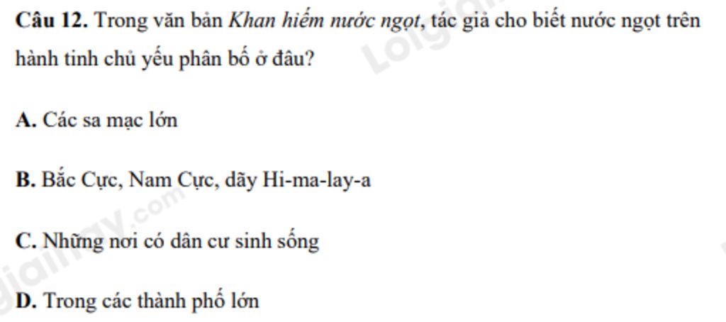 `-` Trong văn bản "Khan hiếm nước ngọt", tác giả đã cho biết nước ngọt trên hành tinh chủ yếu phân bố ở Bắc Cực, Nam Cực và dãy Hi - ma - lay - a (những nơi lạnh giá, nước đóng băng).