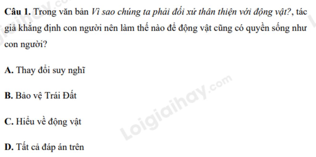 Câu `1` : Trong văn bản "Vì sao chúng ta phải đối xử thân thiện với động vật ?", tác giả khẳng định con người nên làm thế nào để động vật cũng có quyền sống như con người?