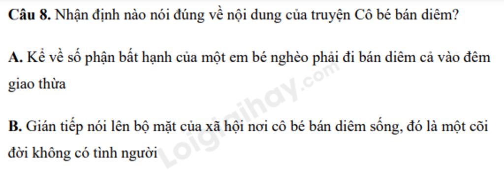 Câu 8. Nhận định nào nói đúng về nội dung của truyện Cô bé bán diêm?