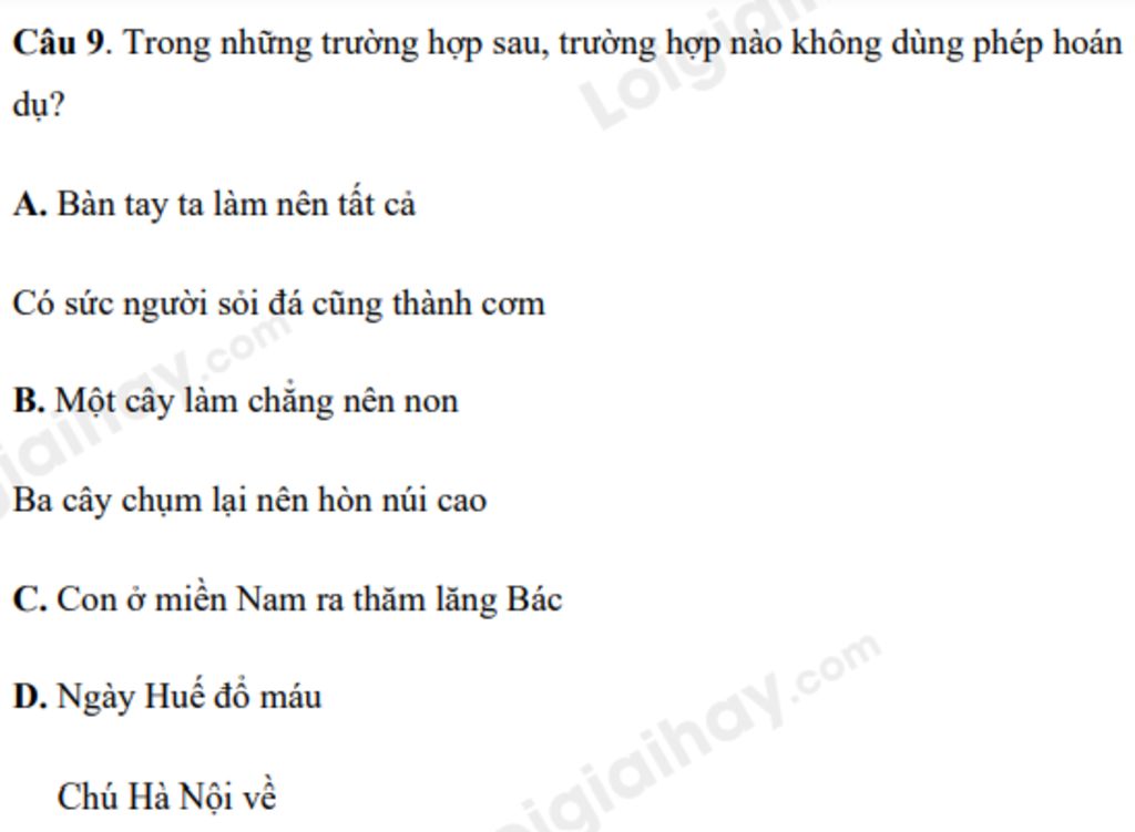 Câu 9. Trong những trường hợp sau, trường hợp nào không dùng phép hoán dụ?