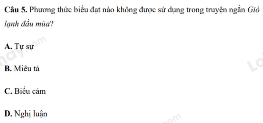 Câu 5. Phương thức biểu đạt nào không được sử dụng trong truyện ngắn Gió lạnh đầu mùa?
