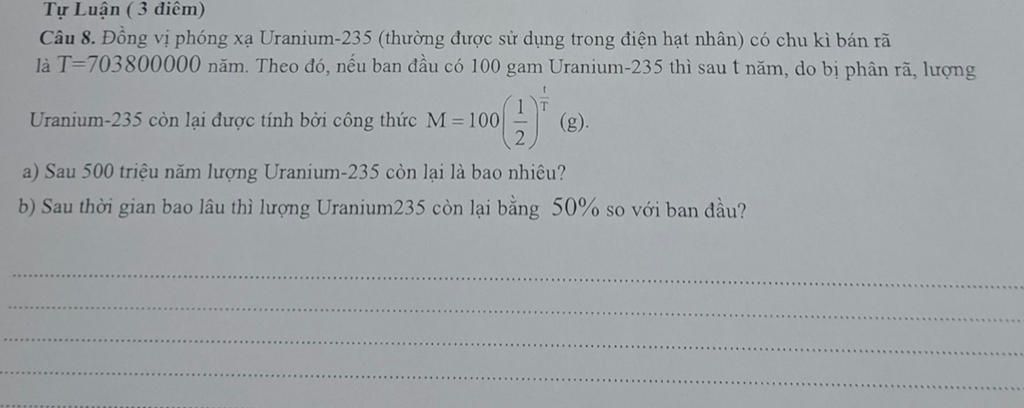 Vậy sau `703,8` triệu năm, khối lượng của Uranium-235 còn lại một nửa.