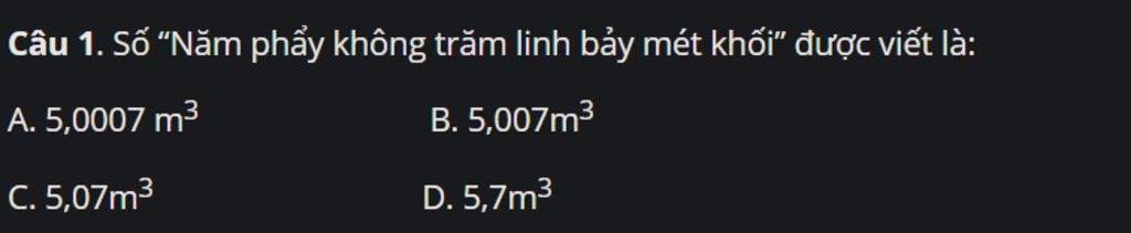 Số '' Năm phẩy không trăm linh bảy mét khối '' được viết là `5,007m^3`