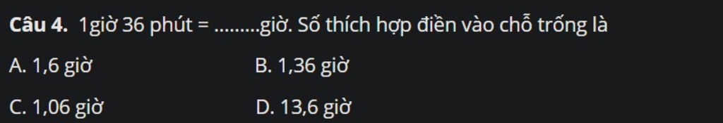 Nên: `1` giờ `36` phút `= 1+0,6 = 1,6` giờ