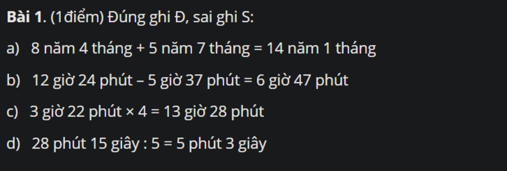 `d) 28` phút `15` giây `:5` `= 28/5` phút `3` giây
