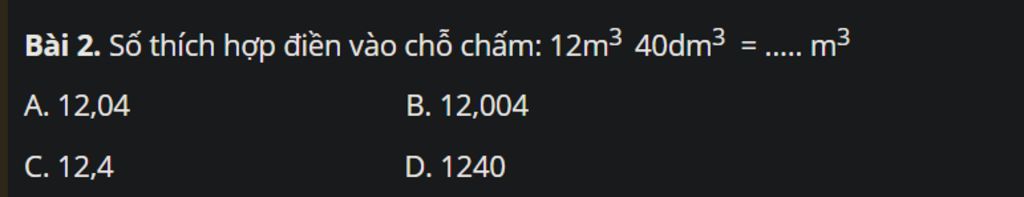 Vậy `12m^3 40dm^3=12+0,040=12,040m^3=12,04dm^3`