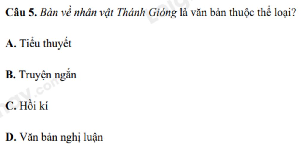 Câu `5:` Bàn về nhân vật Thánh Gióng là văn bản thuộc thể loại:
