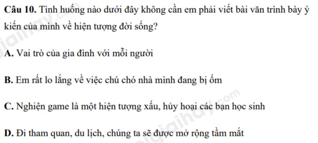 Câu `10` : Tình huống nào dưới đây không cần em phải viết bài văn trình bày ý kiến của mình về hiện tượng đời sống?