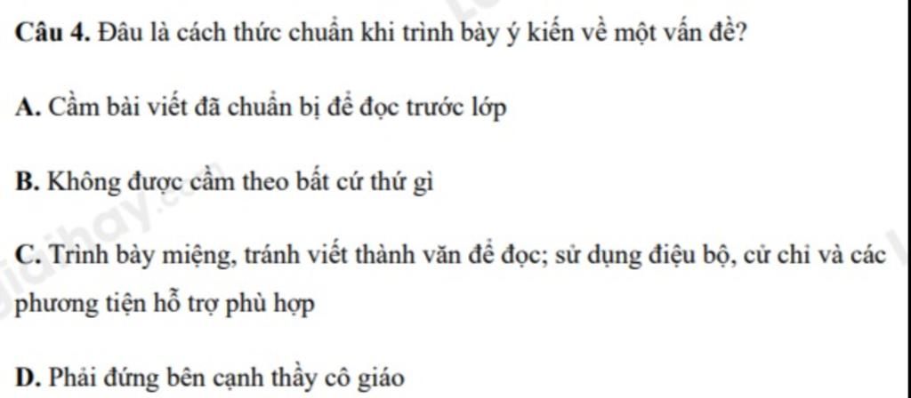 Câu 4. Đâu là cách thức chuẩn khi trình bày ý kiến về một vấn đề?