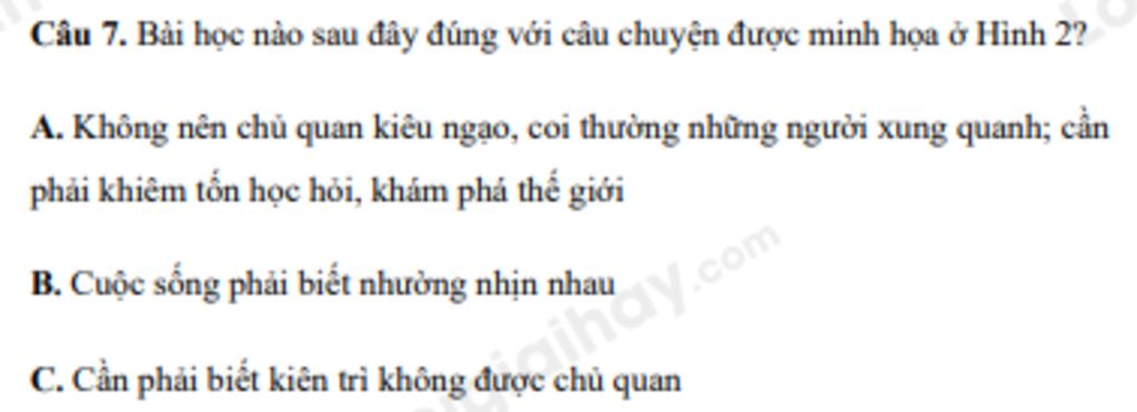 C7 : A. Không nên chủ quan kiêu ngạo, coi thường những người xung quanh; cần phải khiêm tốn học hỏi, khám phá thế giới
