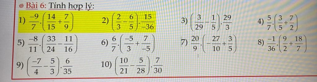 6) $\dfrac{6}{7}$ . ( $\dfrac{- 5}{3}$ + $\dfrac{7}{- 5}$)