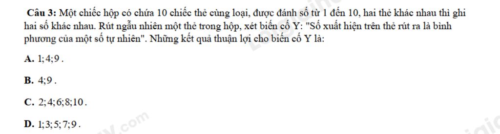 Vậy, có 3 kết quả thuận lợi cho biến cố Y: "Số xuất hiện trên thẻ rút ra là bình phương của một số tự nhiên" là 1,4,9